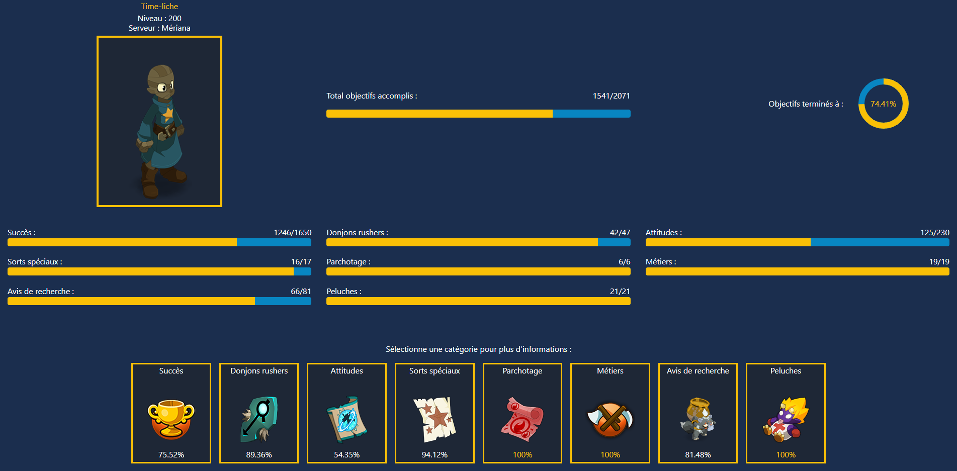 Depuis "Mes stats", sélectionnez un jeu et le(s) personnage(s). Vous verrez votre progression globale, le détail par catégorie, et pourrez filtrer objectifs accomplis / manquants.