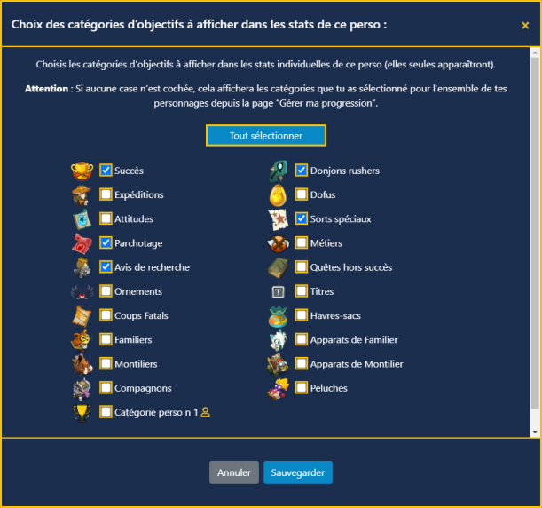 Cochez les catégories à prendre en compte pour ce personnage et sauvegardez. Tant que rien n'est coché, ce sont les catégories globales qui s'appliquent.
