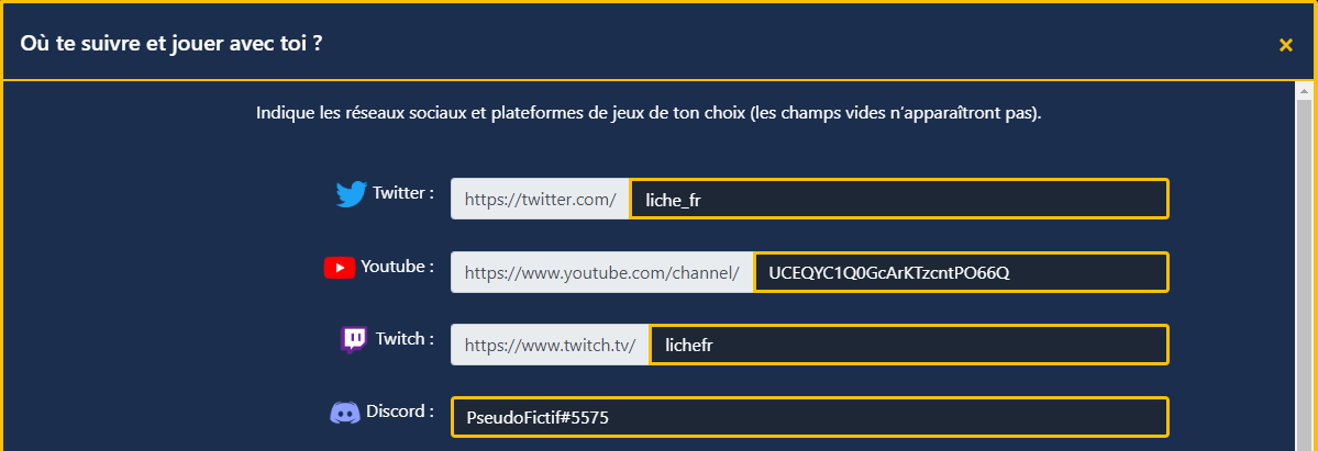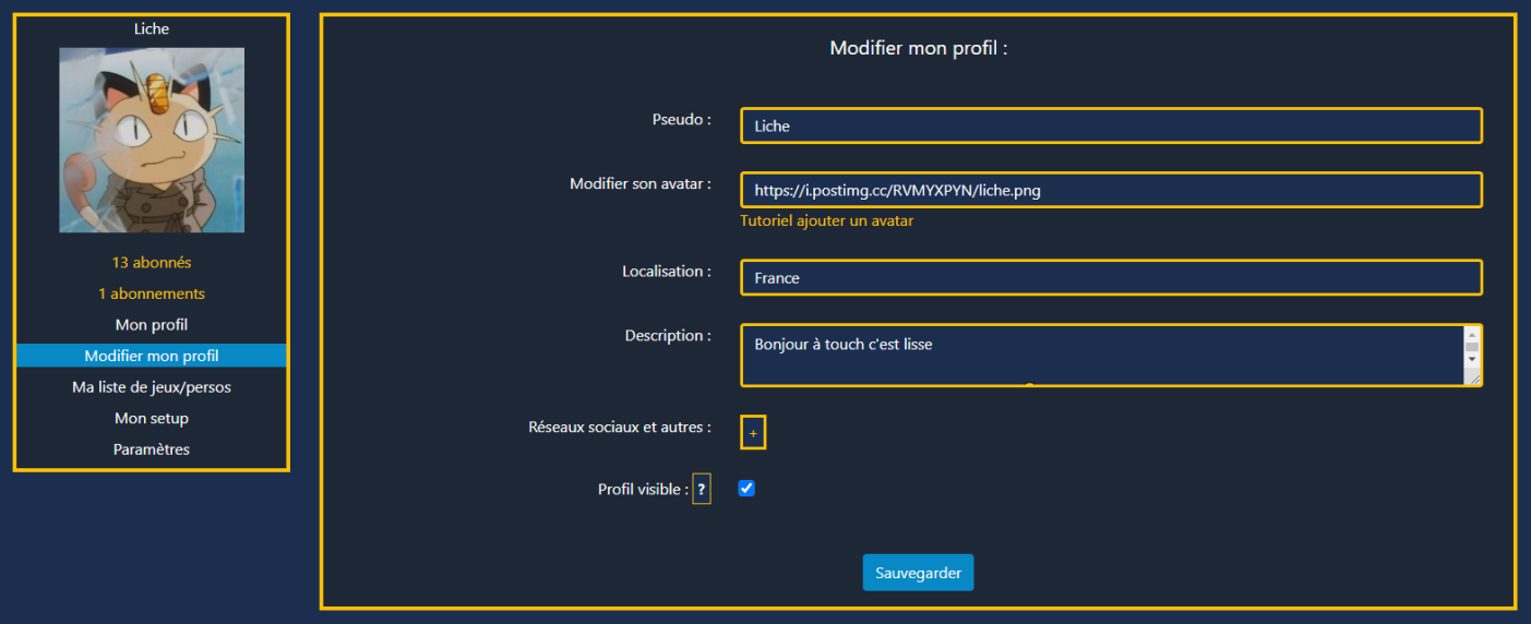Depuis "Modifier mon profil", renseignez pseudo, localisation, description, avatar (via postimages.org), réseaux sociaux et setup.