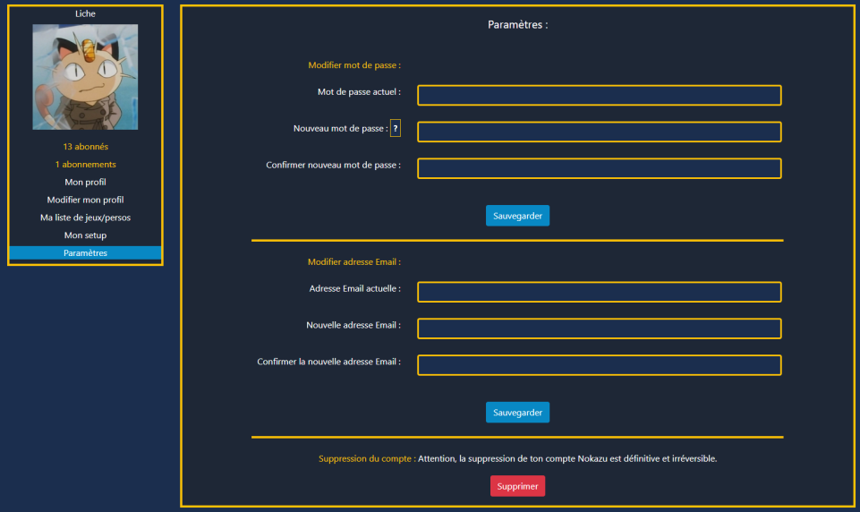 Tout se passe depuis "Paramètres" (menu déroulant en haut à droite). Modifiez mail ou mot de passe, ou demandez la suppression de votre compte.