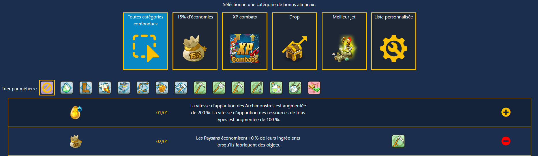 L'outil almanax liste et trie les meilleurs bonus de l'année par catégories et métiers. Accessible sans connexion, il est recommandé d'être connecté pour créer une liste personnalisée.