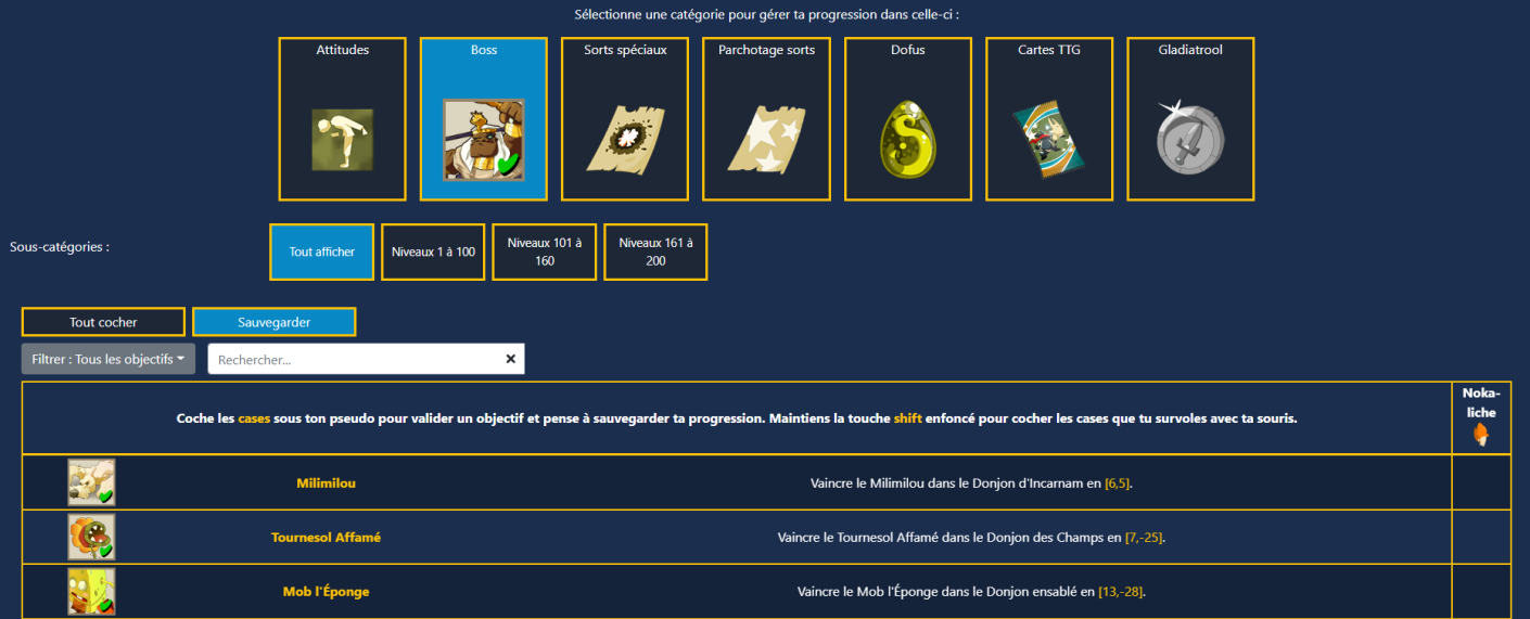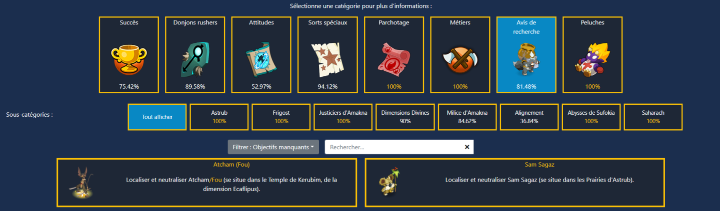 Depuis "Mes stats", sélectionnez un jeu et le(s) personnage(s). Vous verrez votre progression globale, le détail par catégorie, et pourrez filtrer objectifs accomplis / manquants.