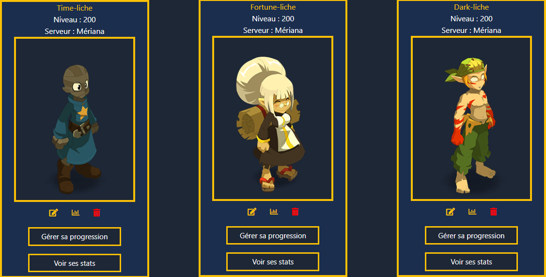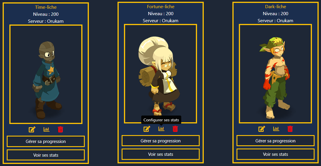 Sélectionnez le jeu et le(s) personnage(s) depuis "Gérer ma progression". Vous pouvez gérer plusieurs personnages simultanément.