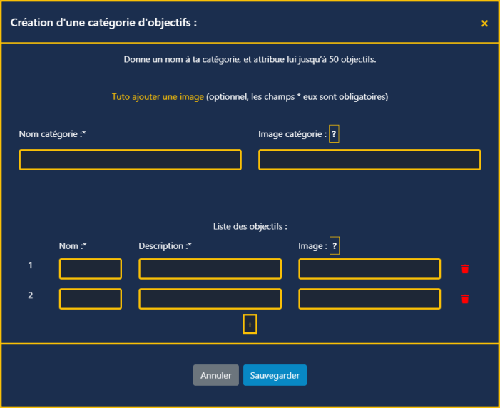 Renseignez un nom, une image (optionnel — voir la FAQ), et les objectifs. Sauvegardez.