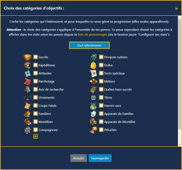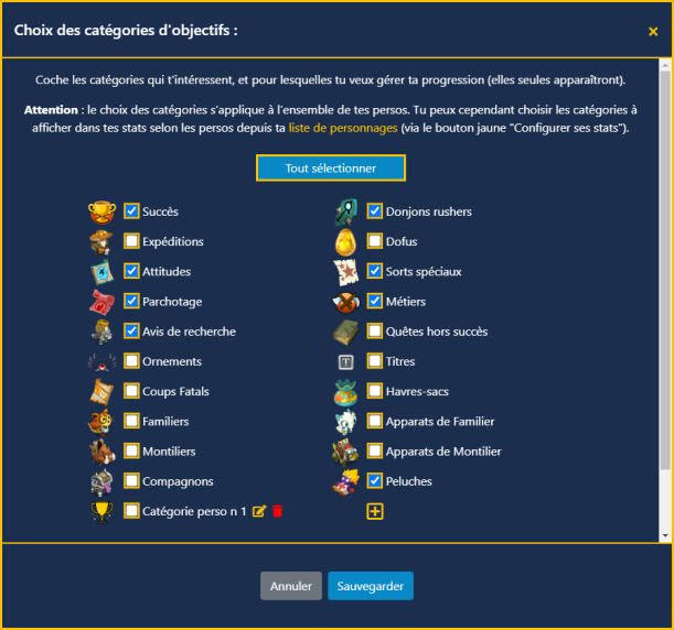 Cochez les catégories à prendre en compte pour ce personnage et sauvegardez. Tant que rien n'est coché, ce sont les catégories globales qui s'appliquent.