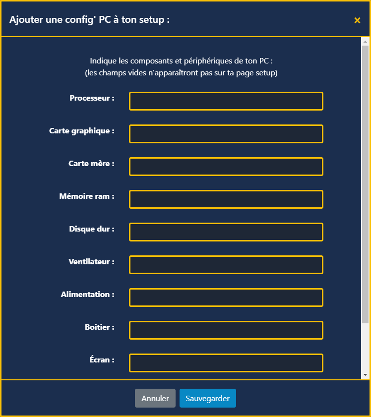Setup (Config' PC, Accessoires, Consoles) accessible via "Mon setup" :