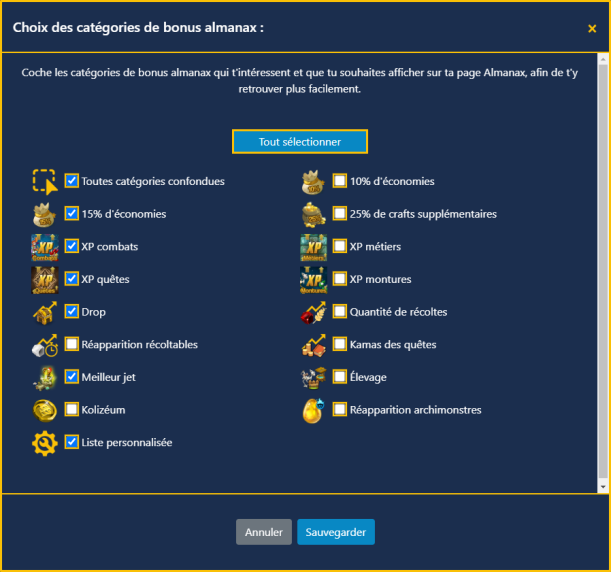 L'outil almanax liste et trie les meilleurs bonus de l'année par catégories et métiers. Accessible sans connexion, il est recommandé d'être connecté pour créer une liste personnalisée.