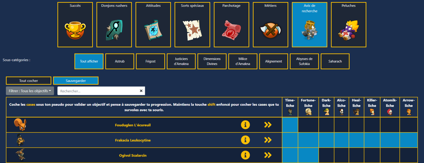 - La double flèche coche/décoche l'objectif sur tous les personnages sélectionnés.